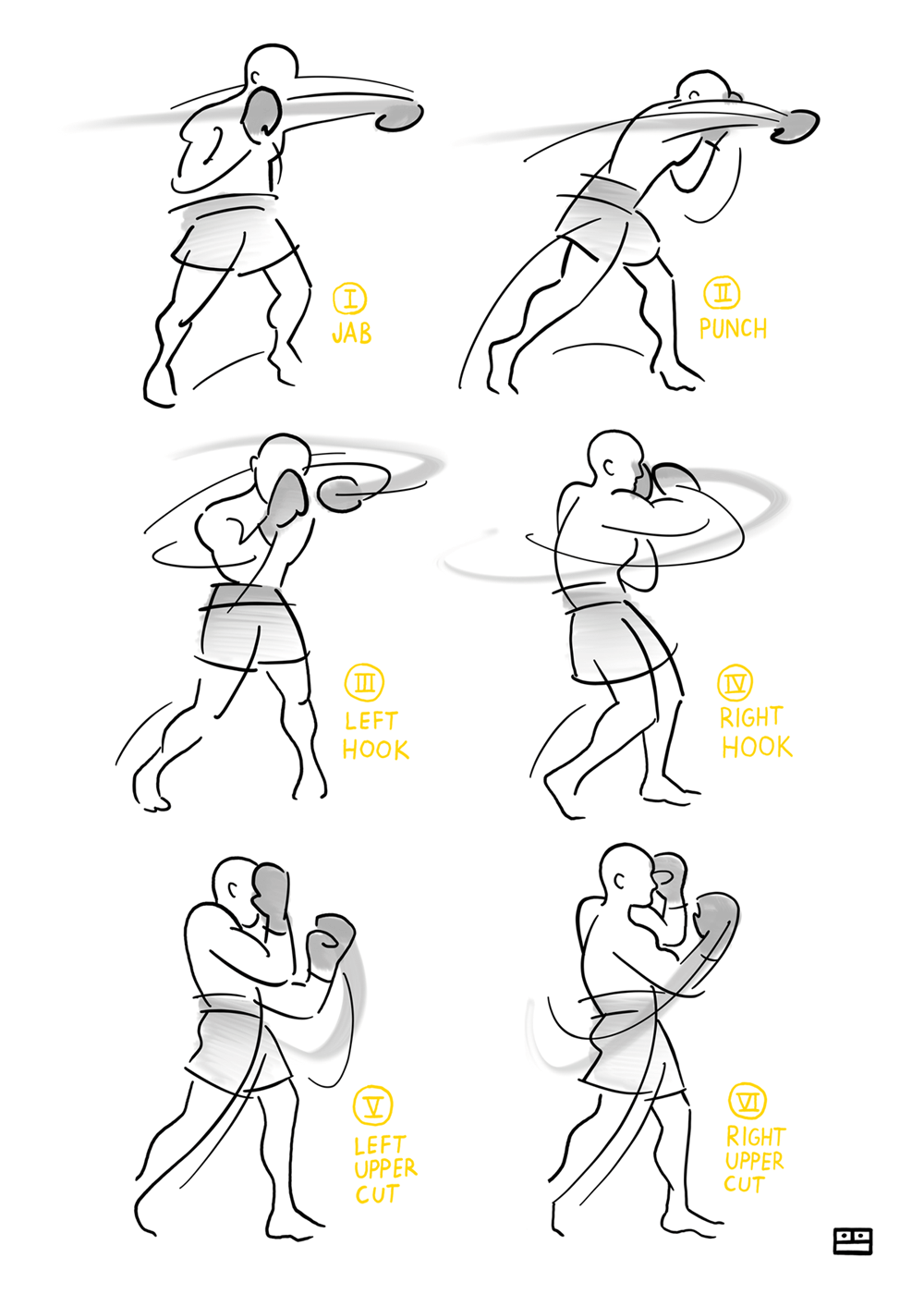 The basic punches in boxing consist of the jab, the punch, the right hook, the left hook, the right uppercut, and the left uppercut. The image was originally conceived for an exhibition and eventually ended up at the Pandas Fightcrew boxing club in Linz.
