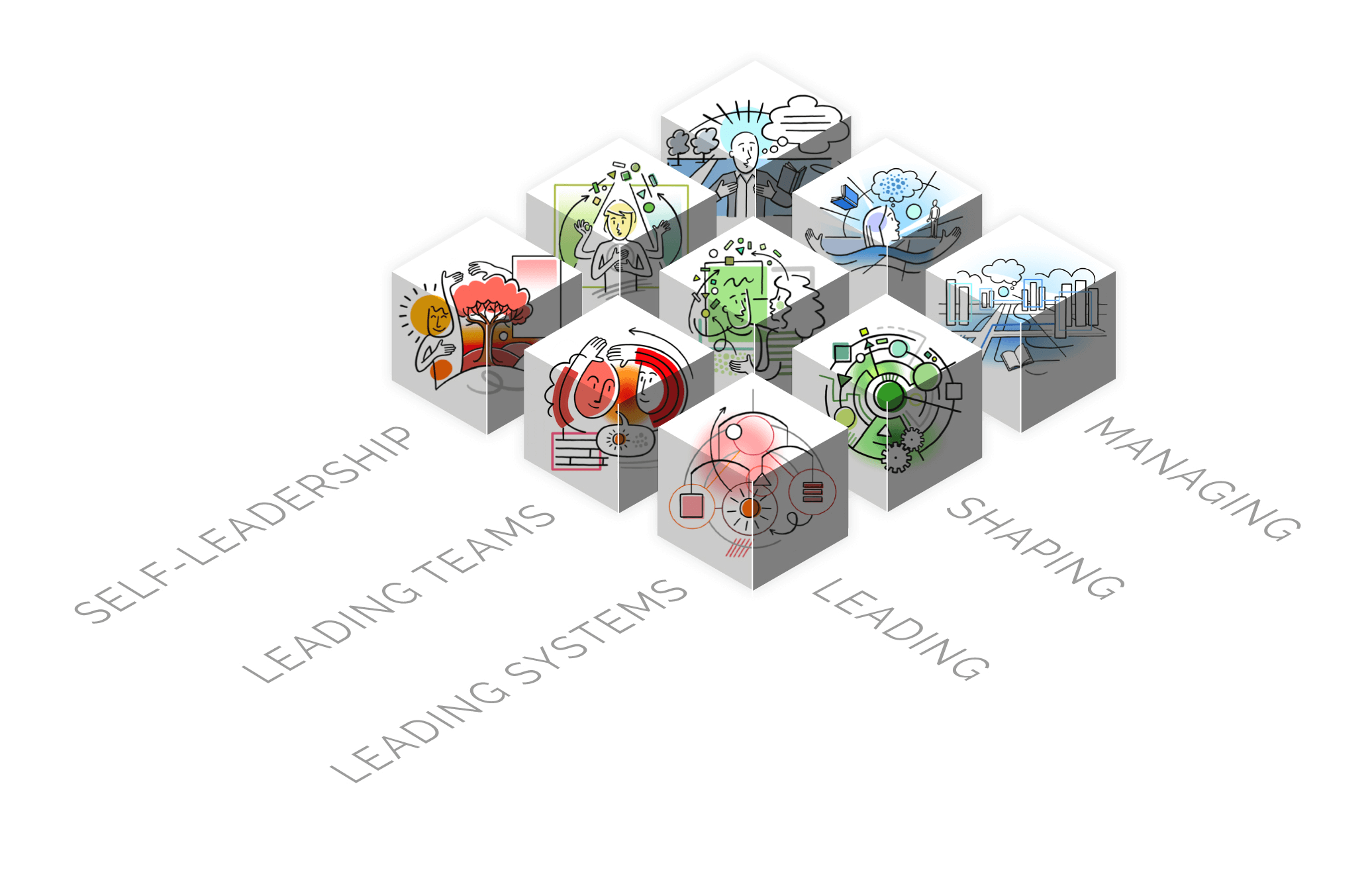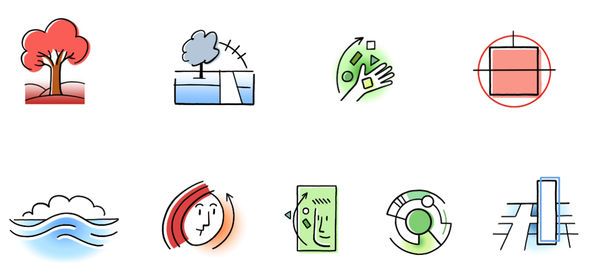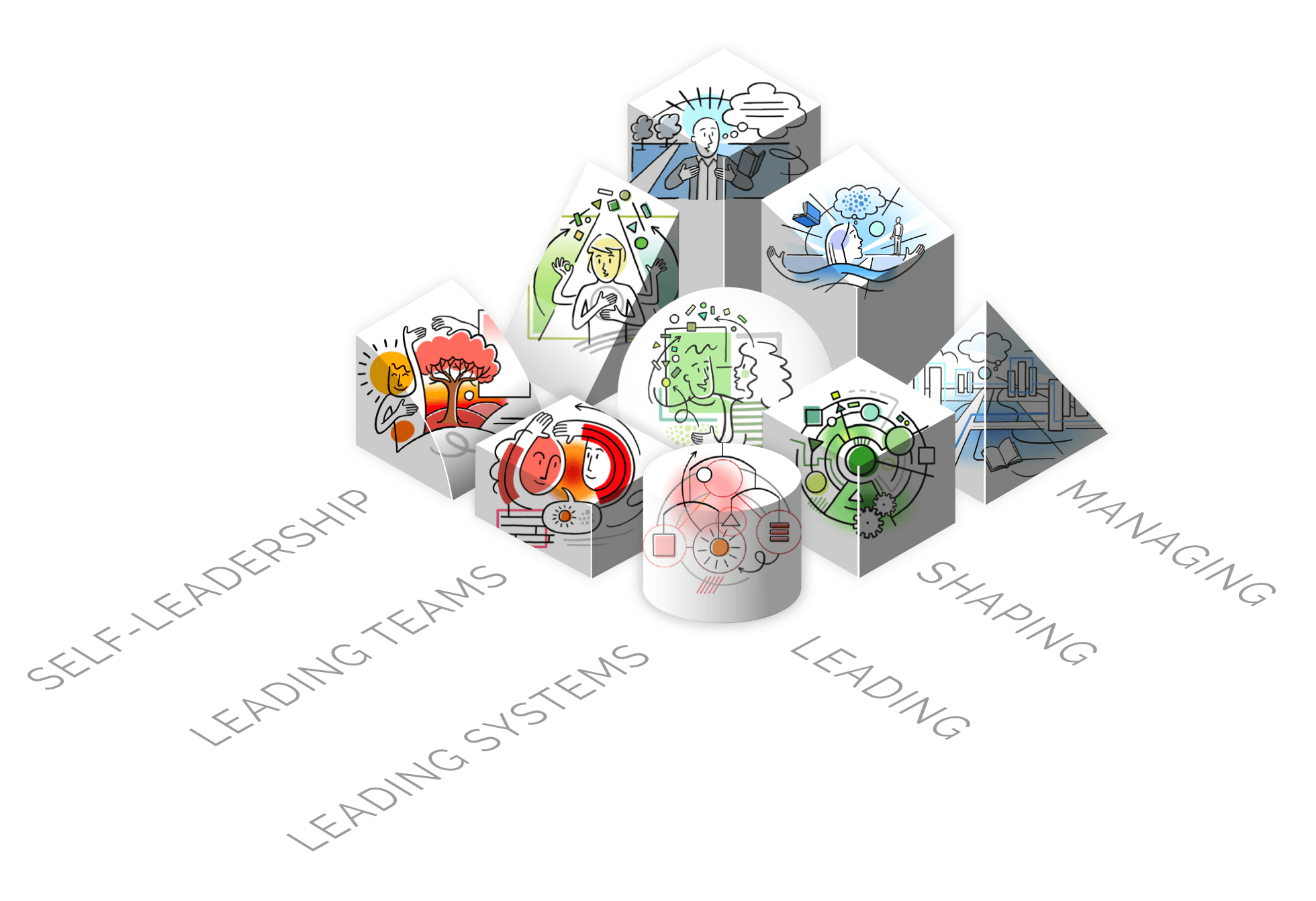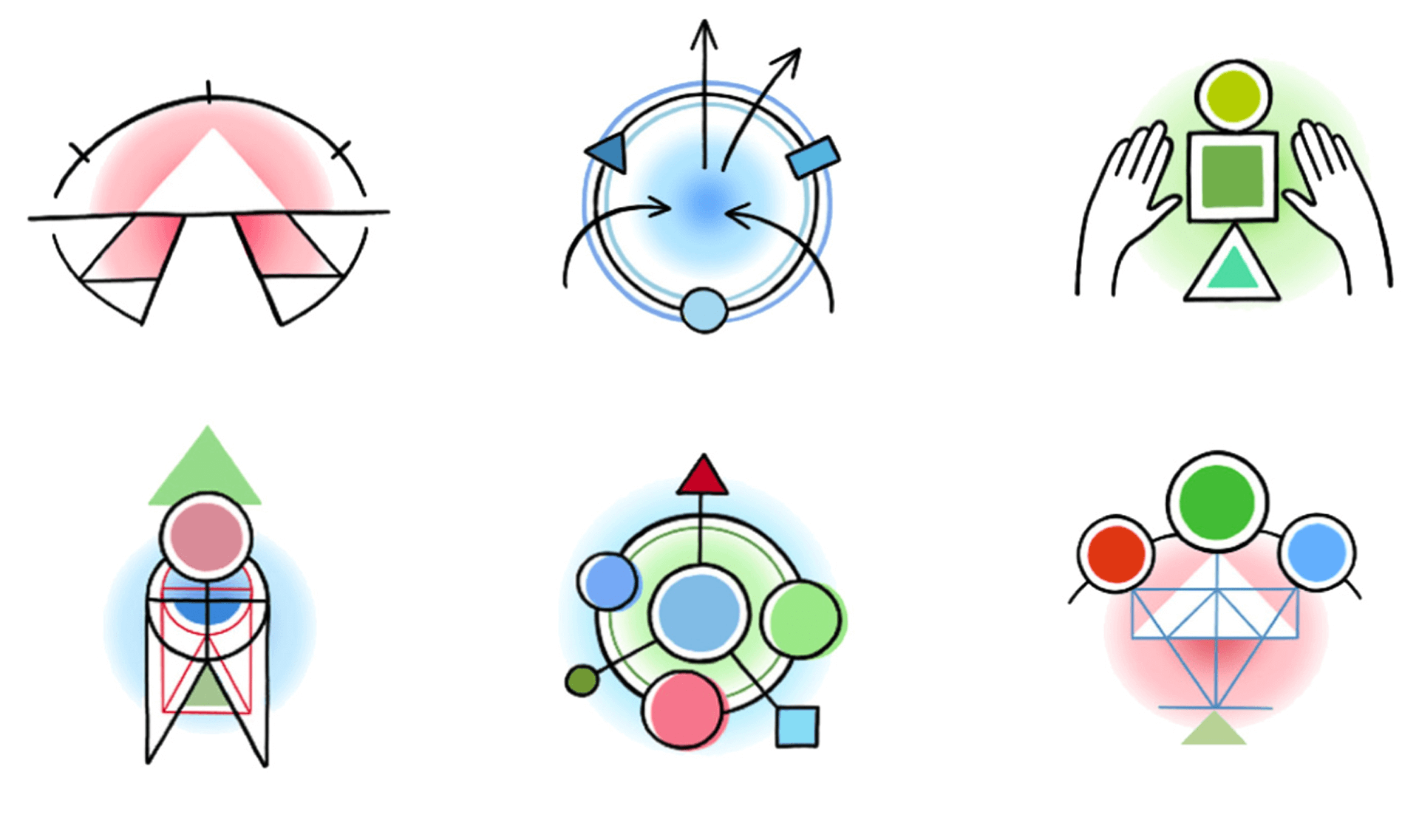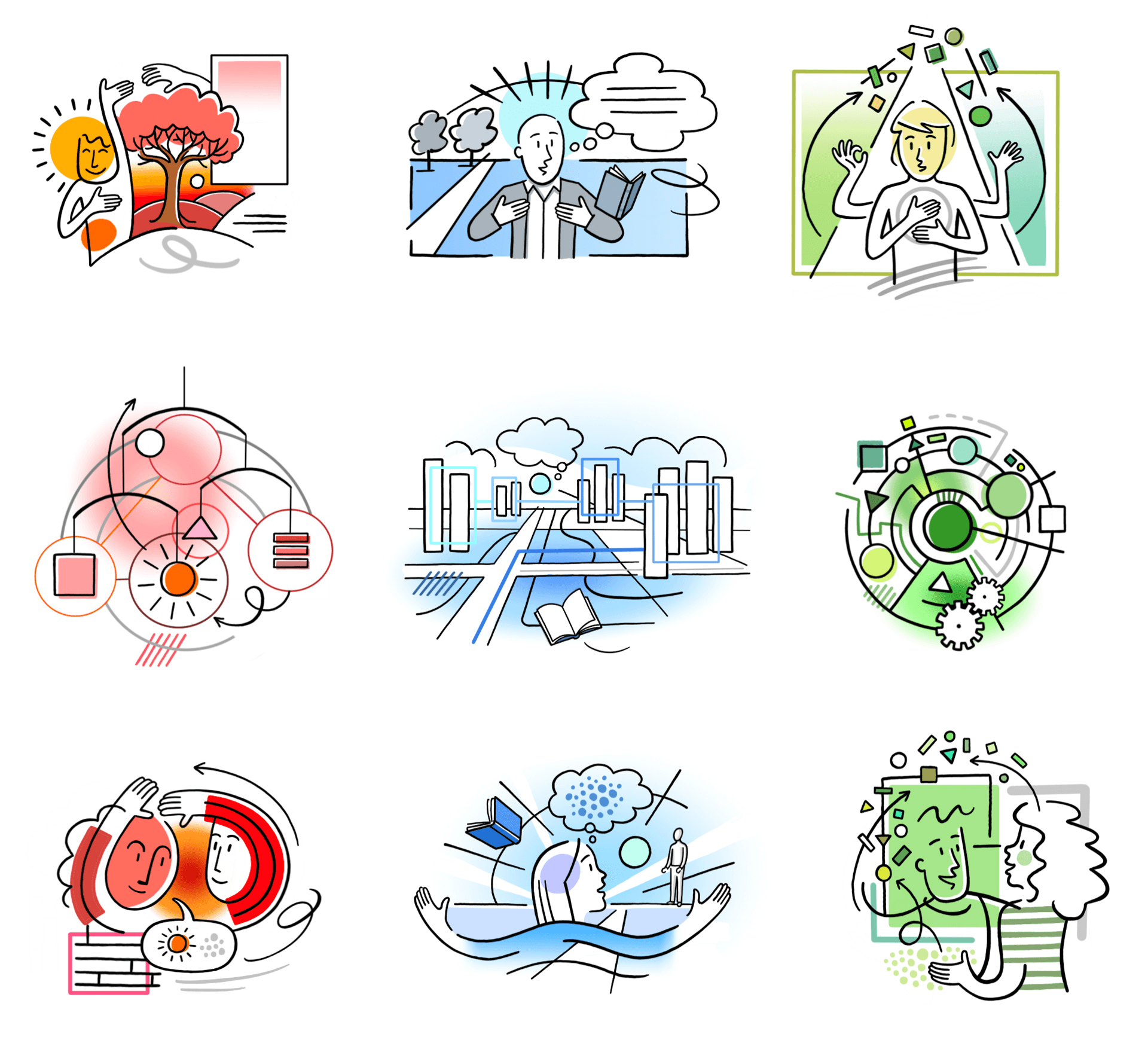 Für diese Unternehmensberatung sollten die Inhalte abstrakt dargestellt werden, um sie in Cluster zu organisieren. Hier kamen Symbole und Zeichen zum Einsatz, um Themenschwerpunkte wie „Persönlichkeit“, „Gruppe“ oder „Systeme“ zueinander in Beziehung zu setzen.