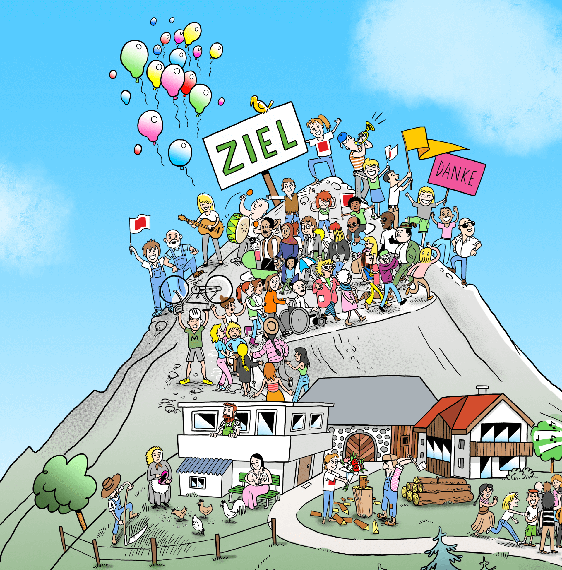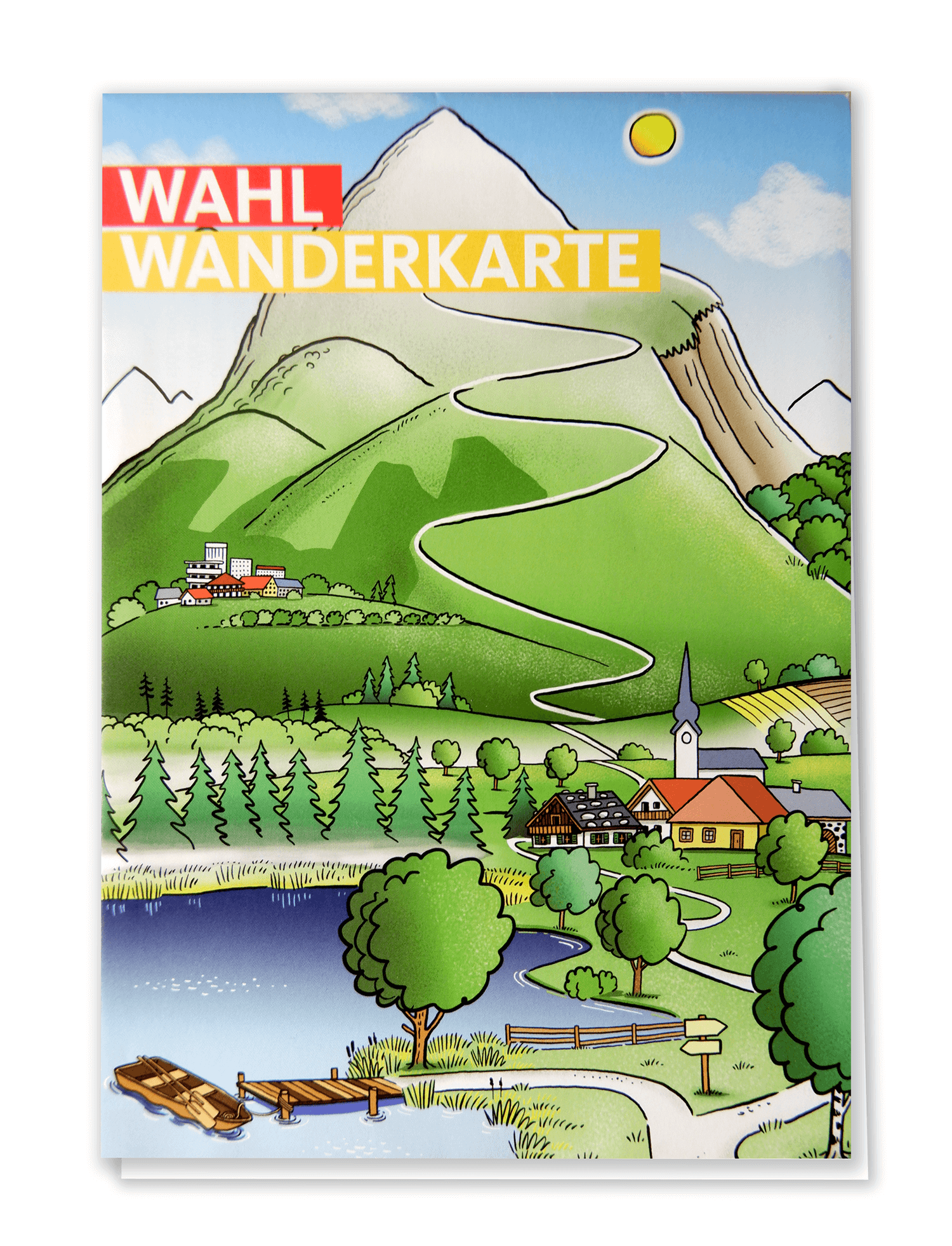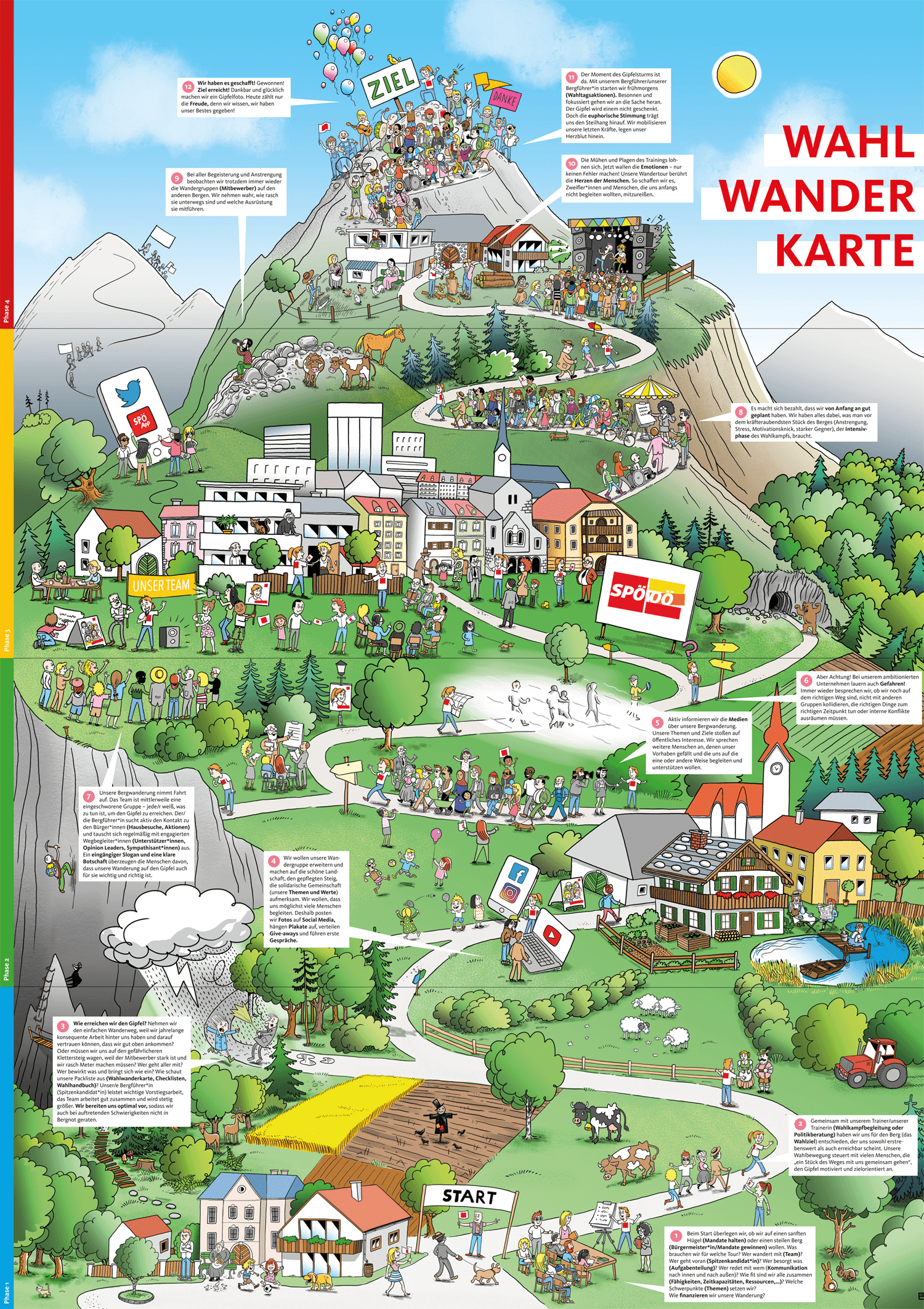 Für einen Wahlkampf wird diese „Wahlwanderkarte“ gestaltet um intern die Mitarbeiter auf einen gemeinsamen Weg zum Ziel vorzubereiten. Hier kommt ein Wimmelbild zum Einsatz, welches die Stationen vom Anfang bis zum Erfolg auf humorvolle Weise darstellt.